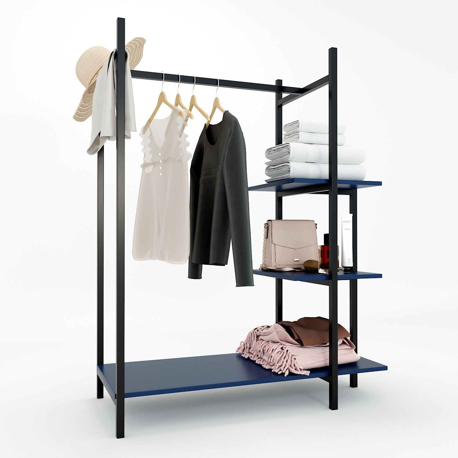 Ngoài ra, kệ cũng phù hợp cho studio chụp ảnh, showroom hoặc các cửa hàng cần trưng bày trang phục một cách gọn gàng và thẩm mỹ.